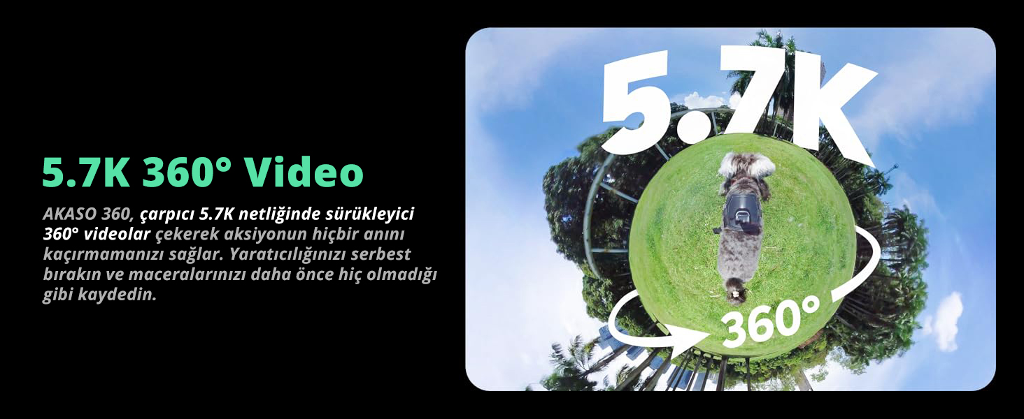 Akaso 360, çarpıcı 5.7K netliğinde, sürükleyici 360° videolar kaydeder ve aksiyonun hiçbir anını kaçırmamanızı sağlar. Yaratıcılığınızı serbest bırakın ve maceralarınızı daha önce hiç olmadığı gibi kaydedin.