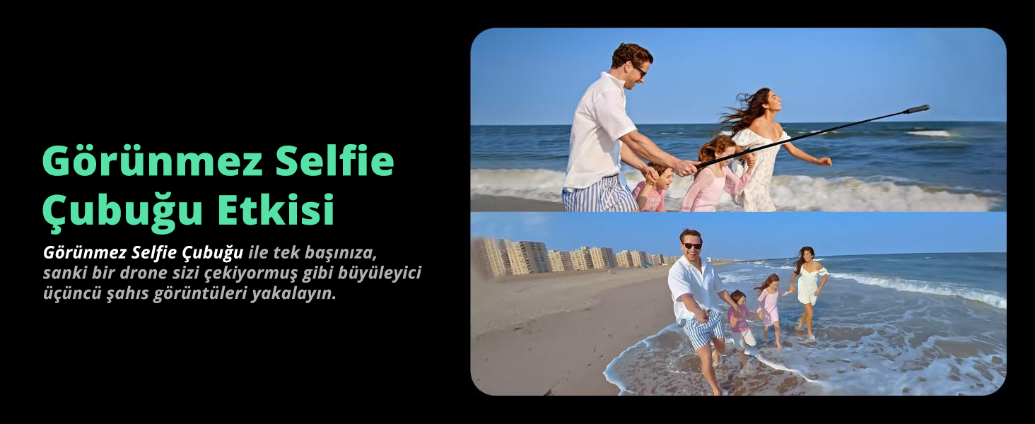 Çekimlerinizi başka bir kişi yapıyormuş gibi bir etki sunan görünmez selfie çubuğu özelliği sayesinde yüksekten çekimler yapabilirsiniz. Çekim yaparken selfie çubuğu otomatik olarak videolardan silinir.