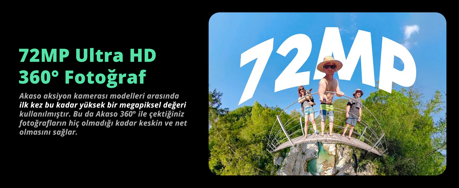 Akaso aksiyon kamerası modelleri arasında en yüksek çözünürlük 72MP değeri ile Akaso 360° Aksiyon Kamerası’na aittir. Bu da fotoğraflarınız için kusursuz keskinlik ve netlik sağlar.
