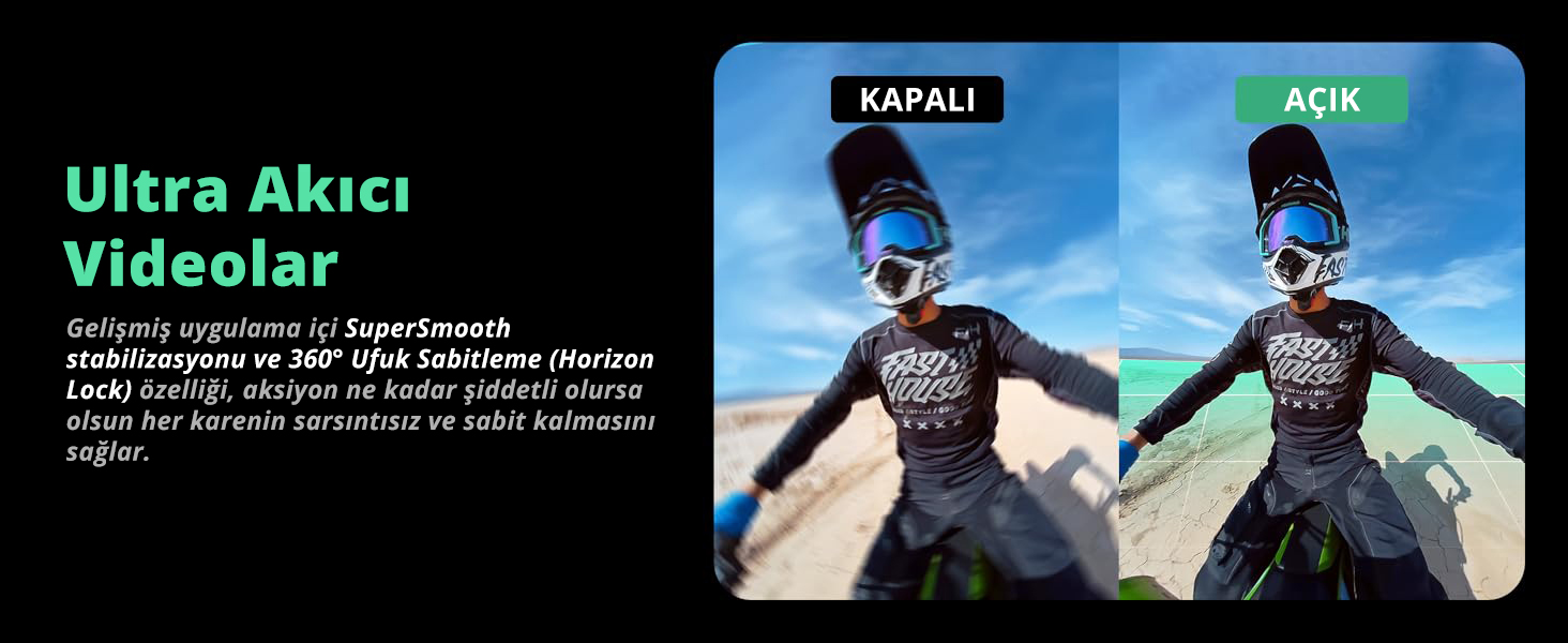 Çekim esnasında oluşan sarsıntılar can sıkıcı sonuçlara sebep olabilir. Akaso 360 aksiyon kamerası gelişmiş SuperSmooth stabilizasyon algoritmaları sayesinde adeta gimbal kullanmışsınız gibi pürüzsüz video kayıtları sunar.