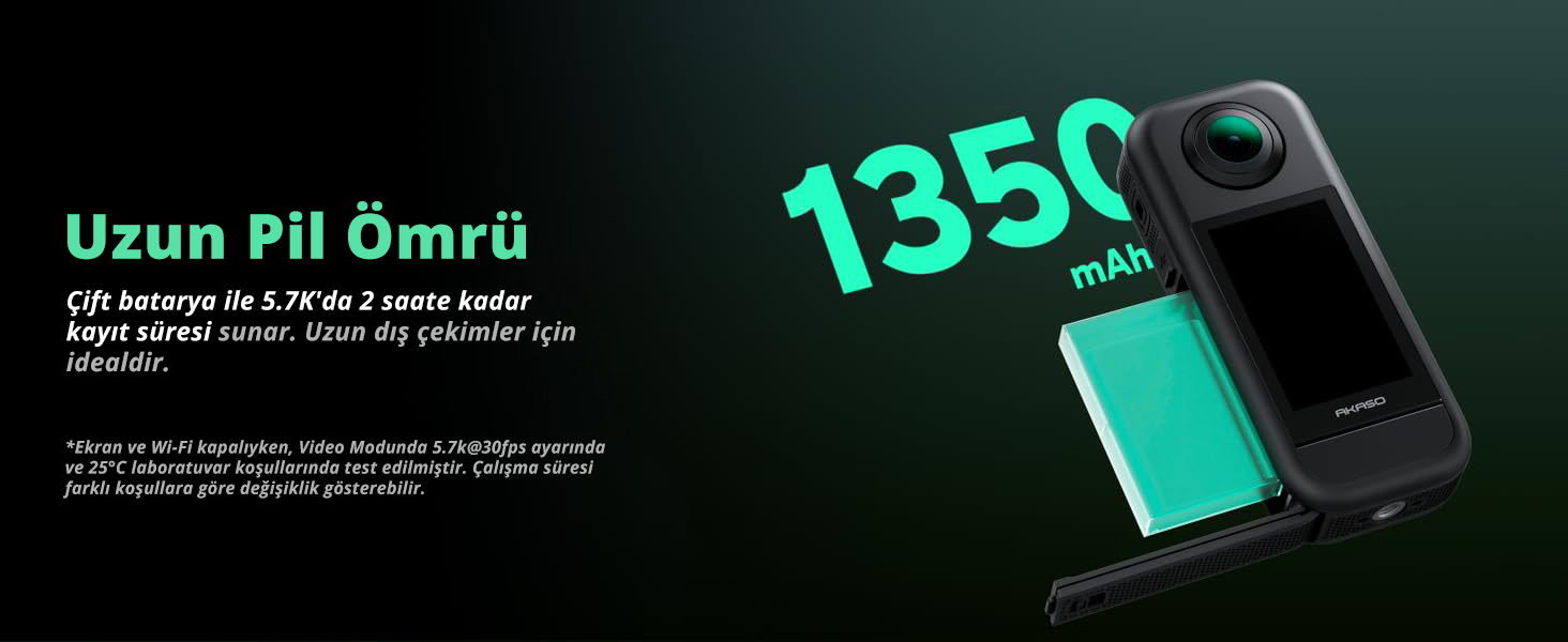 1350mAh pili ile 60 dakikaya kadar 5.7K çekim yapabilirsiniz. Kutu içinde yer alan yedek bataryaları kullanarak çekim süresini uzatabilirsiniz.