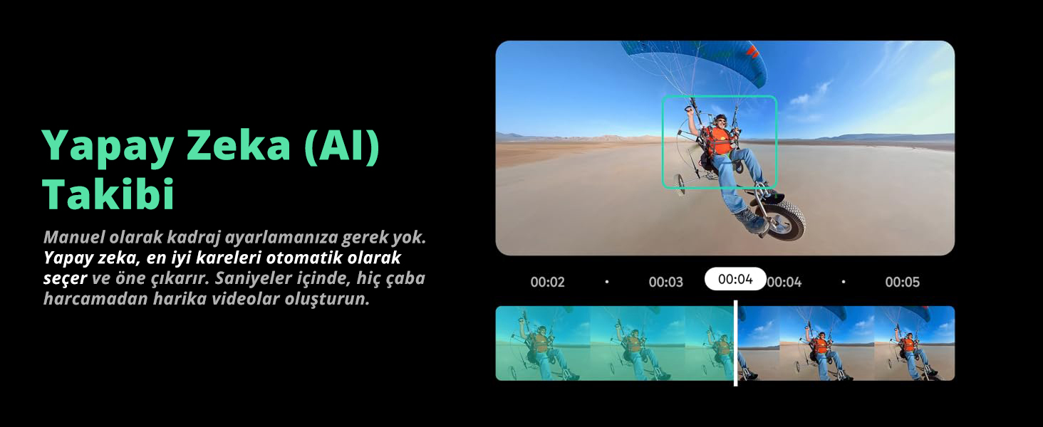 Akaso 360 ile macerayı her açıdan kayıt altına alın. Gelişmiş özelliklerle donatılan 360° aksiyon kamera vloggerlar, ekstrem sporlar yapan sporcular ve herkes için tasarlanmıştır. Yapay zeka destekli nesne takibi sayesinde objenizi akıllıca algılar ve profesyonelce izler. Bu sayede nesne her karede merkezde kalır.
