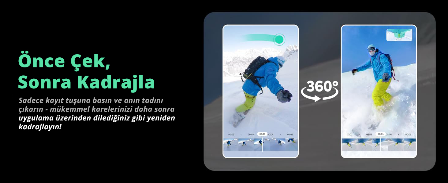 Akaso 360 ile çekim yaparken, önceden planlama yapmanıza gerek yok. Sadece kayıt düğmesine basın ve anı yakalamaya odaklanın. Çekim bittikten sonra Akaso 360 uygulaması üzerinden en iyi açıları seçebilir, videolarınızı yeniden kadrajlayabilirsiniz.
