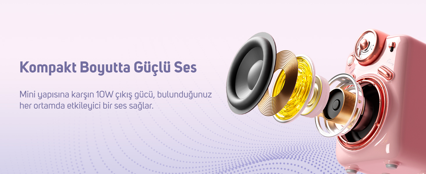 Fairy-Ok Kablosuz Mikrofonlu Hoparlör avuç içine sığacak kadar küçük bir gövdeye sahiptir. Bu sayede hoparlörü yanınızda kolayca taşıyabilir, eğlenceyi arkadaşlarınızla paylaşabilirsiniz. 10W gücündeki ses çıkışı ise bu denli kompakt bir hoparlör için son derece güçlü ses sunar.