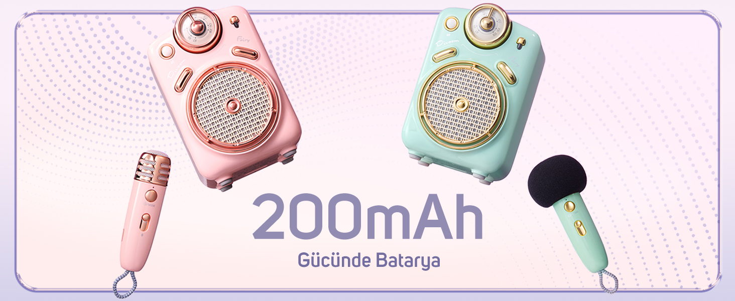 Fairy-OK Radyolu Bluetooth Hoparlör’ün 2000 mAh gücündeki bataryası 6 saate kadar kullanım imkanı sağlar. Kablosuz mikrofunun 350 mah batarya gücü ise 2 ila 2,5 saat kullanım süresi verir. Böylece eğlenceye uzun saatler boyunca ara vermeden devam edebilirsiniz.