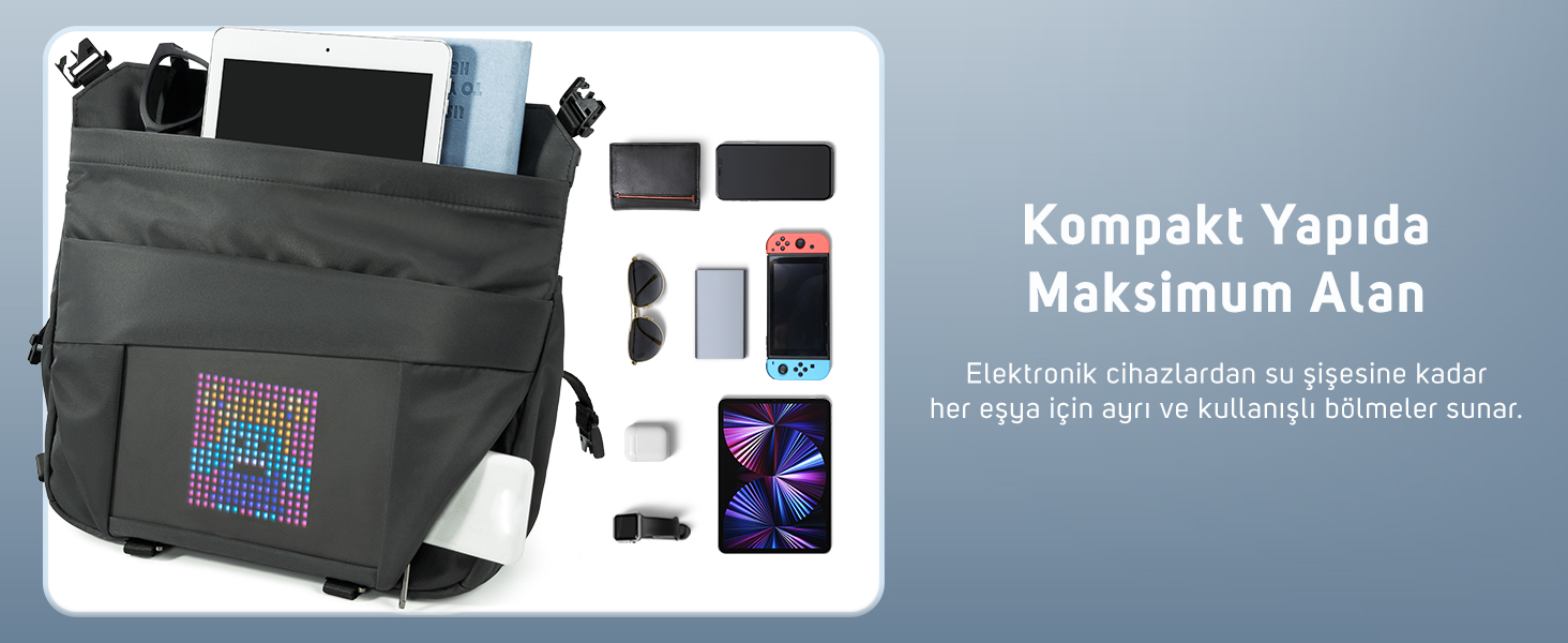 Çantanın kullanımı da son derece basittir. Ekranı kullanmak için bir powerbank kullanmanız gerekir. Çok gözlü tasarımı ve kolay açılıp kapanan klipsleri kullanım konforu sağlar.