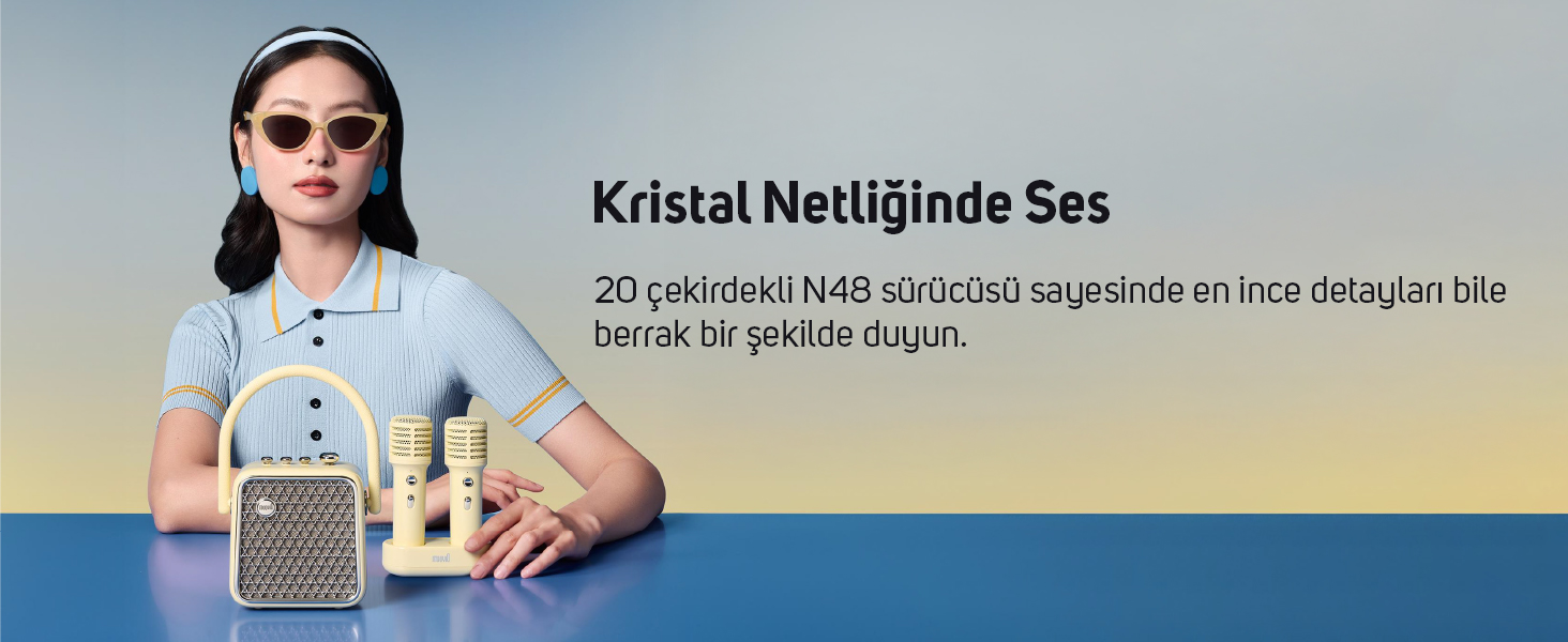 20 çekirdekli N48 tam frekanslı hoparlör sürücüsü, sesin en ince detaylarını yüksek doğrulukla aktararak kristal netliğinde bir ses sunar.