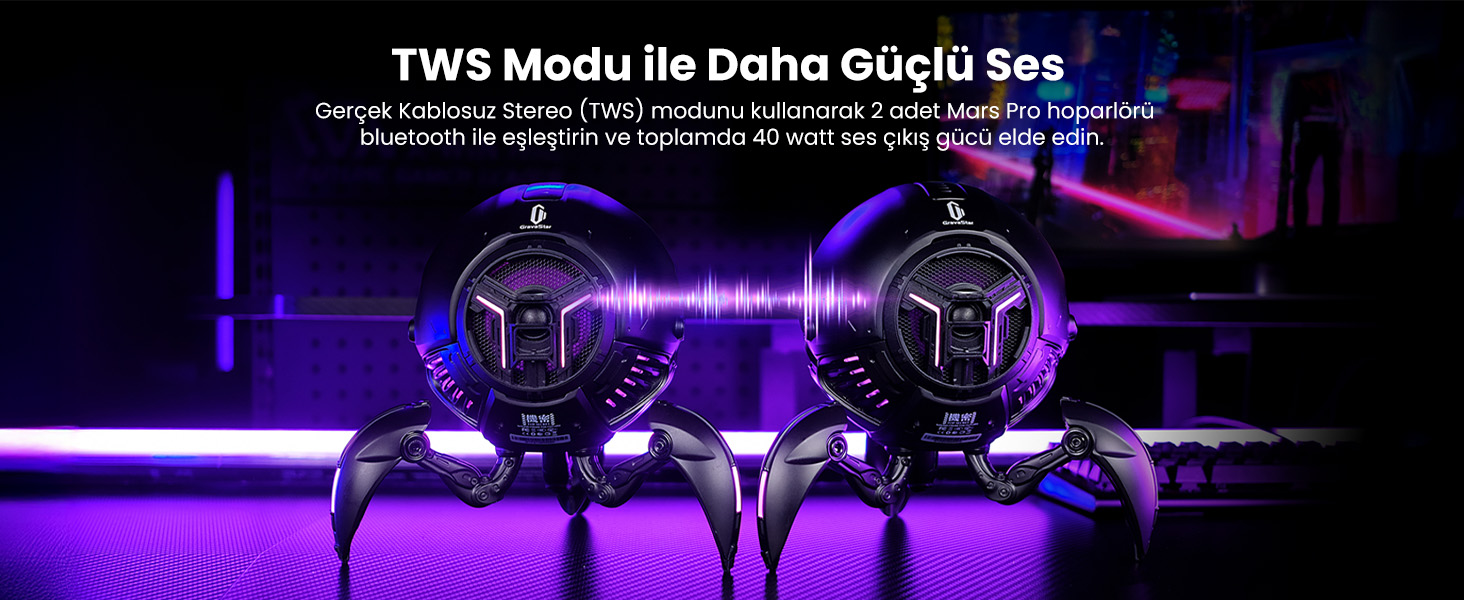 Mars Pro bluetooth 5.0 özelliğinin yanı sıra AUX kablosu ile de ses çalabilen bir hoparlördür. Ayrıca TWS özelliği sayesinde iki adet Mars Pro hoparlörü birbiri ile eşleştirerek güçlü ve etkileyici stereo ses elde edebilirsiniz. (İkinci hoparlör ayrı olarak satın alınmalıdır.)