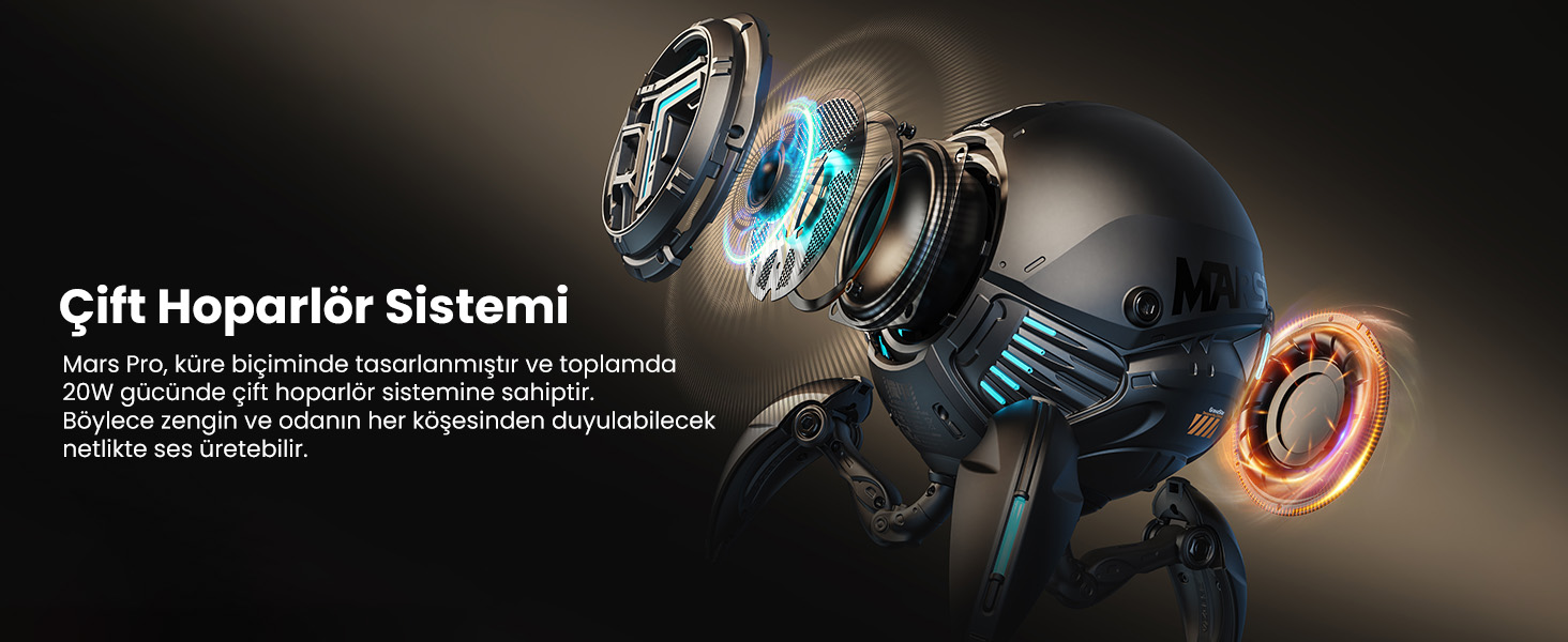 Mars Pro çift hoparlöre sahip güçlü bir hoparlördür. 20 watt ses çıkış gücü ile bir odayı dolduracak kadar dengeli ve zengin sesler üretir. Mars Pro, özel DSP algoritmalarıyla her frekans aralığında mükemmel dengeli ve eşit ses sunar. Pasif bas radyatörü ile küçük bir alandan maksimum bas üretebilir.