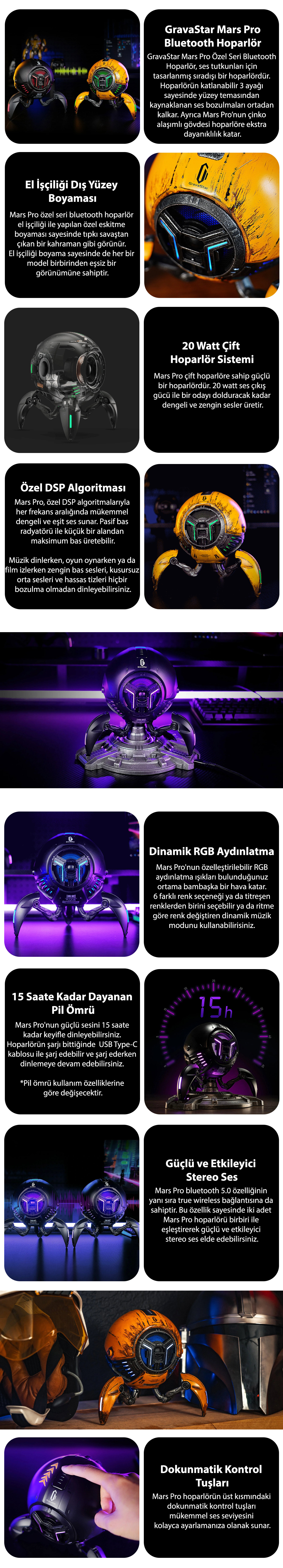 GravaStar Mars ProBluetooth Hoparlör, ses tutkunları için tasarlanmış sıradışı bir hoparlördür. Hoparlörün katlanabilir 3 ayağı sayesinde yüzey temasından kaynaklanan ses bozulmaları ortadan kalkar. Ayrıca Mars Pro’nun çinko alaşımlı gövdesi hoparlöre ekstra dayanıklılık katar.