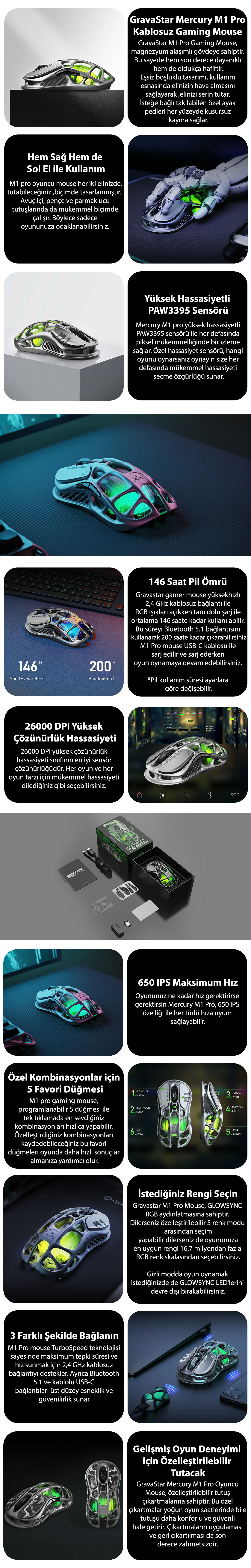 Gravastar Mercury M1 Pro RGB 26K DPI Optik Gaming Mouse, Kablosuz, Magnezyum Alaşımlı, Programlanabilir 5 Tuşlu, Metal Gri