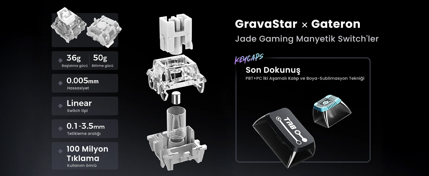 Klavyenin x Gateron Jade Hall Effect manyetik switch’leri tuş vuruşlarınızı 0,005 mm hassasiyetle algılar. Bu da oyun oynarken ya da hızlı yazı yazarken tepki süresini ve konforu maksimum seviyeye çıkarır. Jade Hall Effect manyetik switch, oyun dünyasının lider switch modelidir.