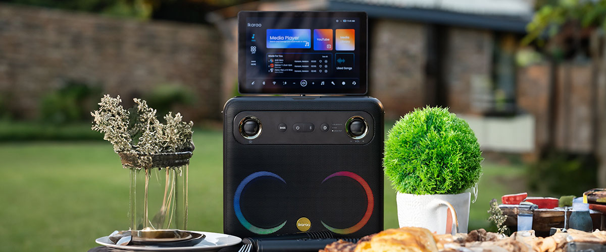 Ikarao Partybox Break X2 300W Karaoke Bluetooth Hoparlör Seti, 10.1" Dahili Tablet, 2 Kablosuz Gizlenebilir Otomatik Şarjlı Mikrofon, RGB Işıklı Taşınabilir Ses Bombası Siyah