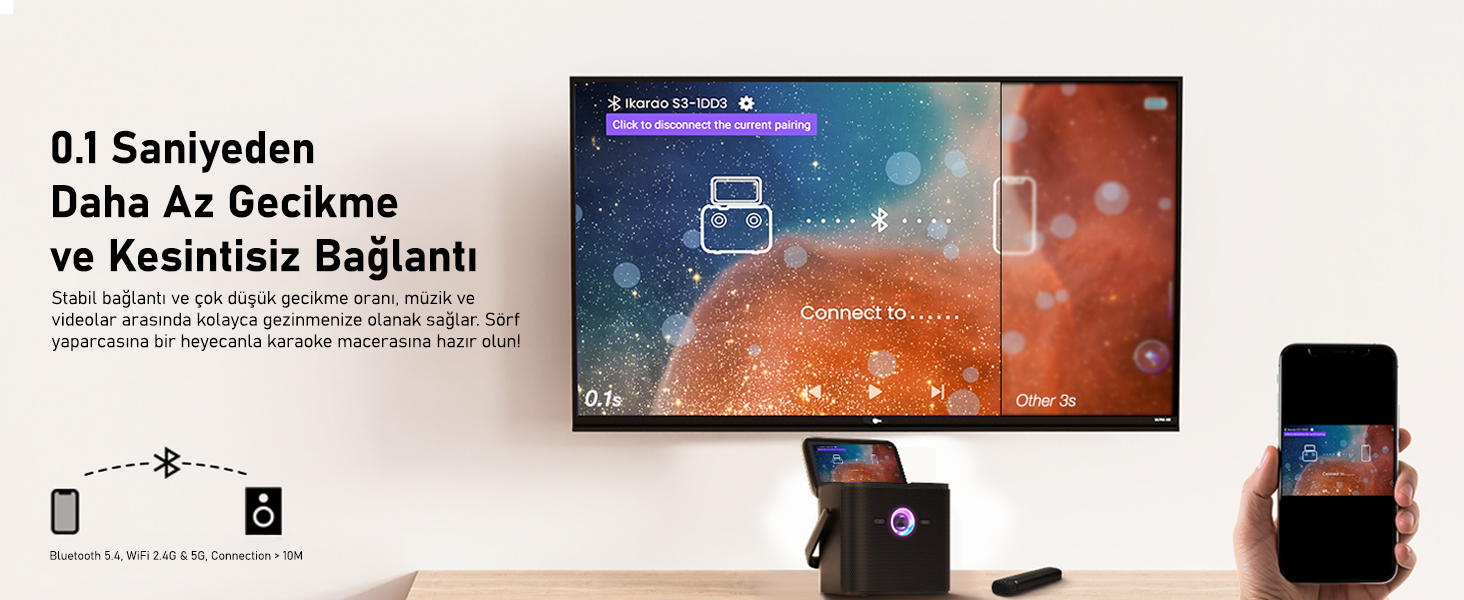 Ikarao Shell S3 karaoke hoparlörü, çift bant Wi-Fi’yi destekler. Bu sayede YouTube gibi platformlardan 4K video kalitesinde kesintisiz akış sağlayarak hem görsel hem de işitsel olarak üstün bir deneyim yaşamanıza olanak tanır. En güncel bluetooth versiyonu olan bluetooth 5.4 teknolojisi, istikrarlı ve düşük gecikmeli bağlantı sunarak sesin görüntüyle senkronize ilerlemesini sağlar. Böylece her şarkı, gecikmesiz ve net bir şekilde ilerler.