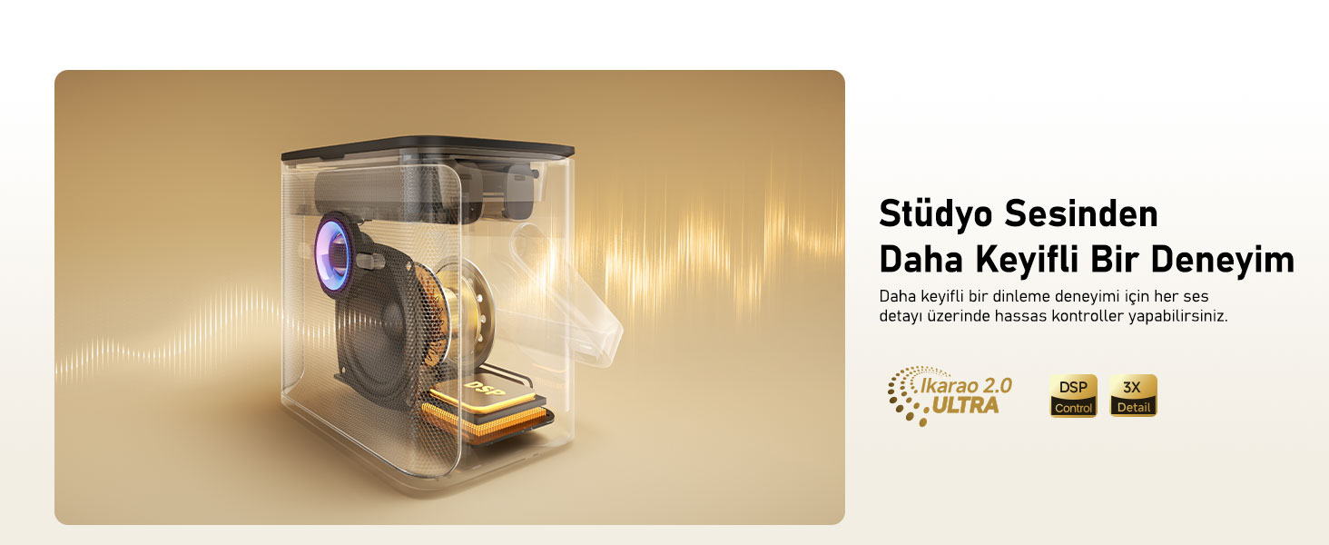 Ikarao Ultrasound 2.0 teknolojisi ve çift çekirdekli DSP çipi sayesinde net, güçlü ve yankısız bir ses deneyimi sunarken gelişmiş bas ve tiz ayrımı sayesinde de müziği her zaman en üst kalitede duyabilirsiniz.