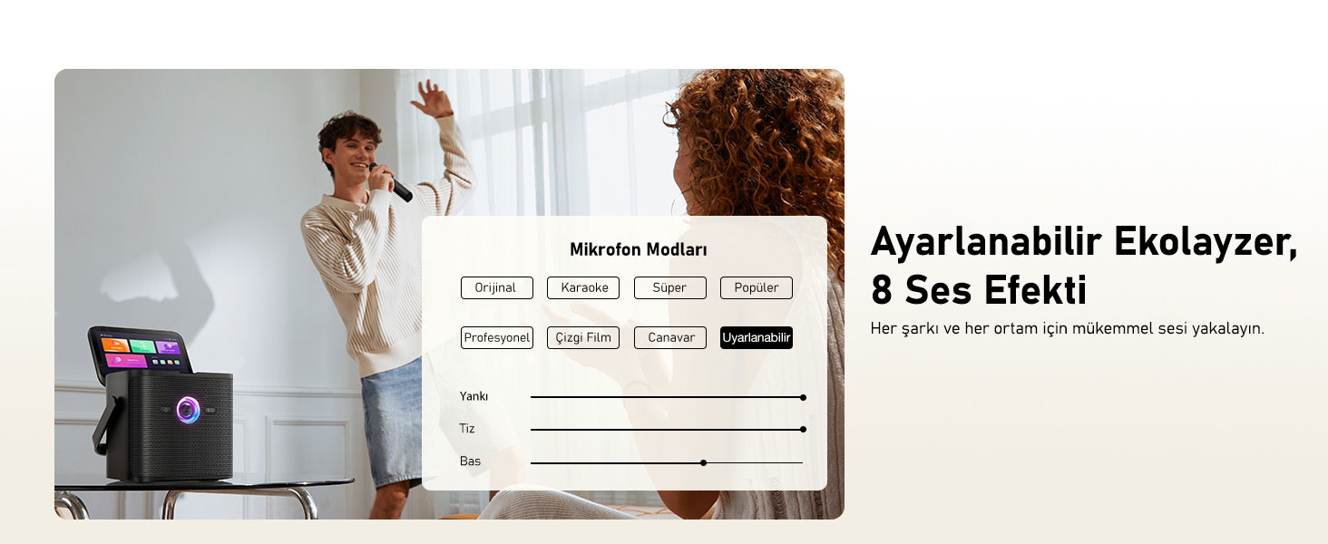 Ikarao Shell S3 hoparlör, 8 farklı ses efekti ve gelişmiş EQ (equalizer) ayarları sayesinde ses deneyiminizi tamamen özelleştirmenize olanak tanır. Orijinal, Karaoke, Süper, Popüler, Profesyonel, Çizgi Film, Canavar ve Özel gibi özgün mikrofon modları ile kendi parti atmosferinizi oluşturabilirsiniz. Dilerseniz de yankı, tiz ve bas ayarları üzerinde tam kontrol sağlayarak sesin derinliğini ve berraklığını istediğiniz biçimde değiştirebilirsiniz.