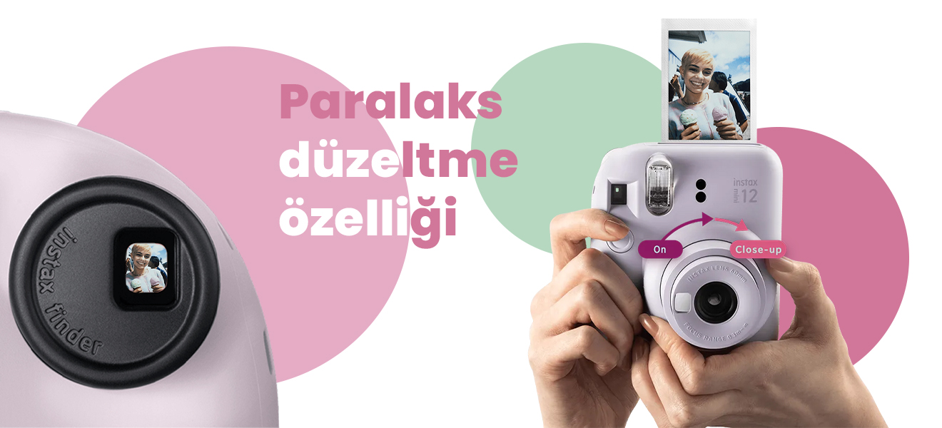 Yepyeni özellikleri ile öne çıkan instax mini 12’in paralaks düzeltme özelliği bulunuyor. Instax fotoğraf makinelerinde şimdiye kadar ilk kez kullanılan bu özellik, özellikle yakın çekimlerde nesnenin en doğru şekilde kadrajın ortasına hizalanmasını sağlıyor.