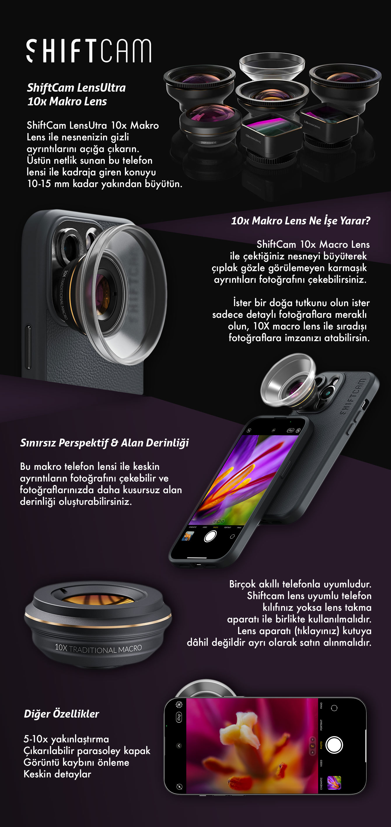 ShiftCam LensUtra 10x Makro Lens ile nesnenizin gizli ayrıntılarını açığa çıkarın.Üstün netlik sunan bu telefon lensi ile kadraja giren konuyu 10-15 mm kadar yakından büyütün.