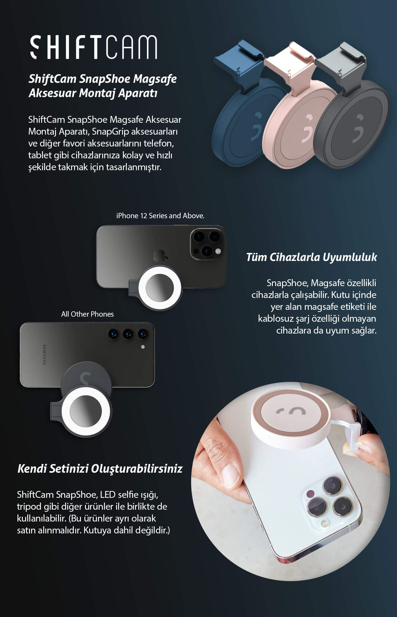 ShiftCam SnapShoe Magsafe Aksesuar Montaj Aparatı, SnapGrip aksesuarları ve diğer favori aksesuarlarını telefon, tablet gibi cihazlarınıza kolay ve hızlı şekilde takmak için tasarlanmıştır.